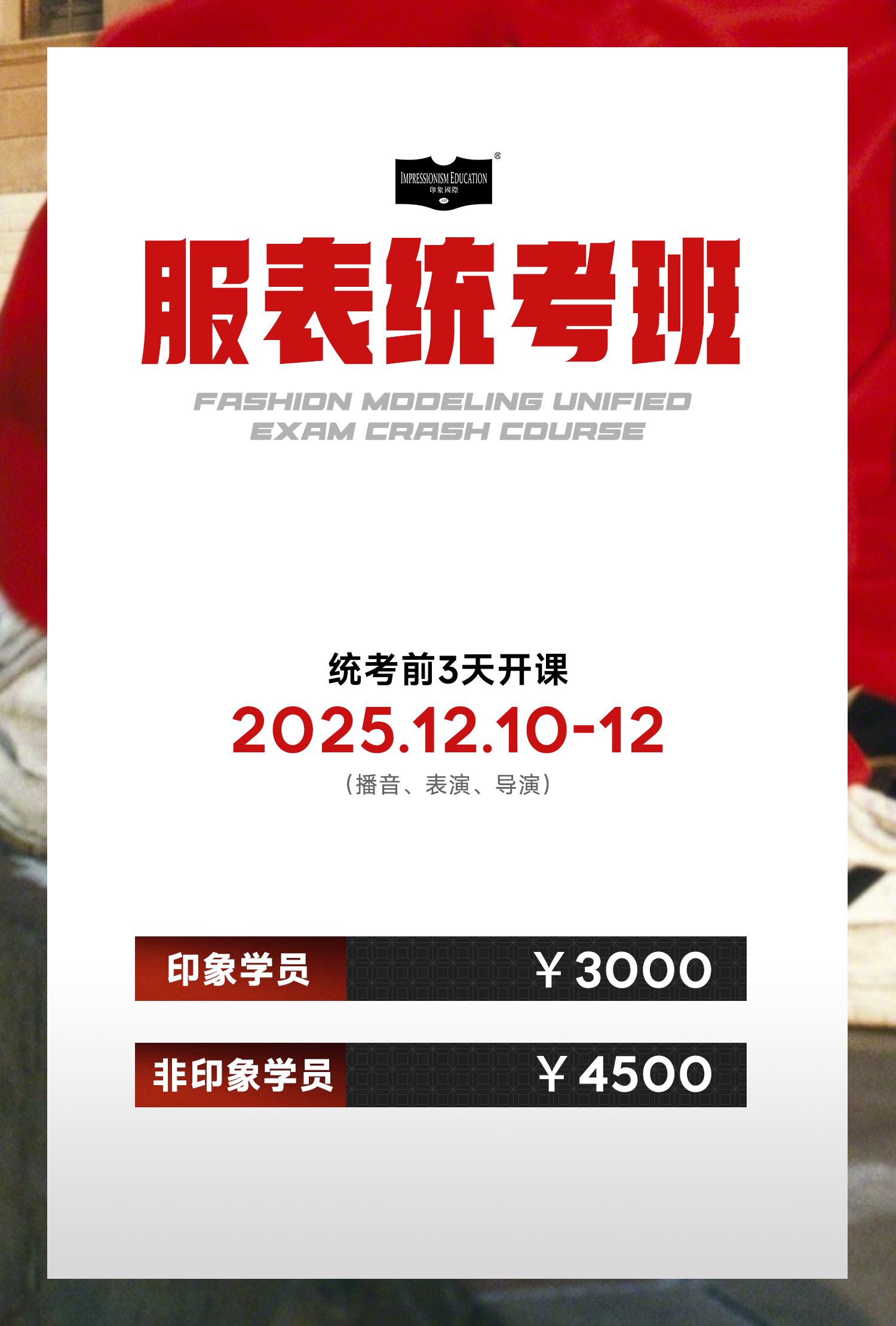 【服装表演突击班】,课程为服表统考前3天,集结顶尖师资,直击考场核心考点,用三天时间实现专业能力的飞跃,给自己多一个选择的机会。