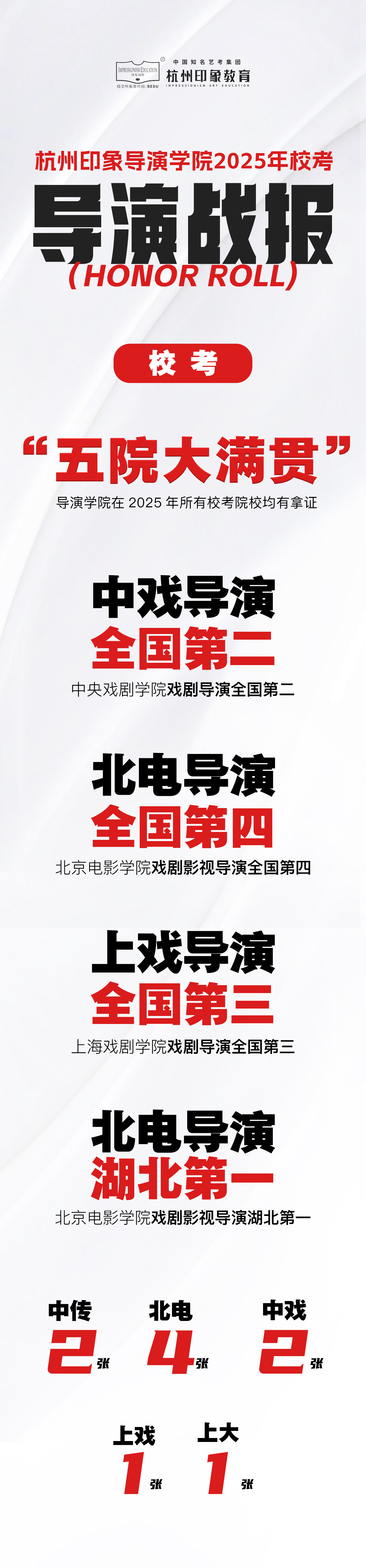 此外,印象25届导演学员们也成功摘取了中国传媒大学、中央戏剧学院、上海戏剧学院、上海大学的校考合格证,达成了“五院大满贯”的校考成就。
