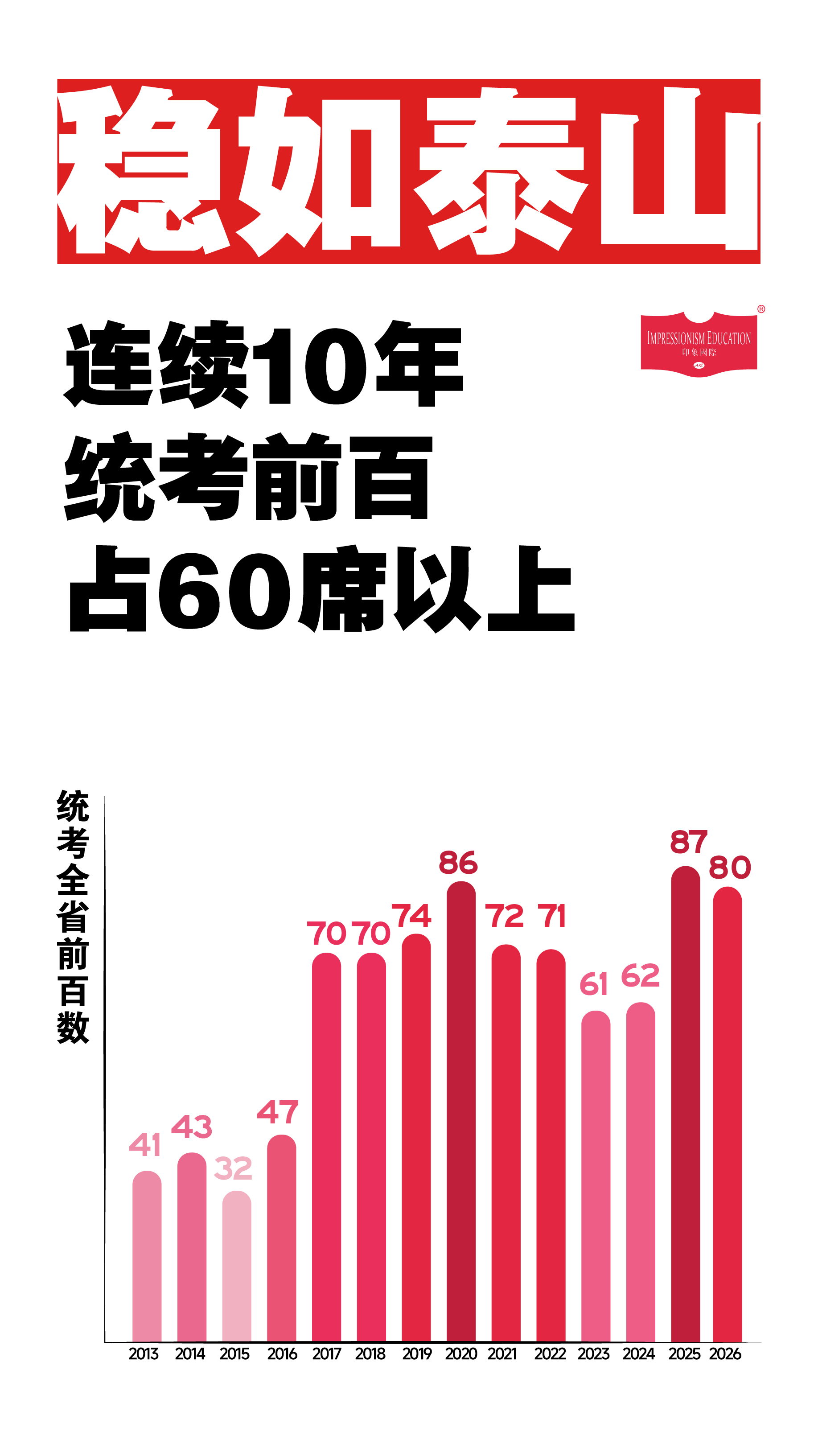 在“全员通过”这一坚实基础之上,更有一份跨越时间的厚重荣耀:连续10年印象教育在全国多省的统考百强榜上,累计席位均稳超60席。截至目前(2026年1月27日),印象学员已斩获80席统考前100,其中前二十占13席。